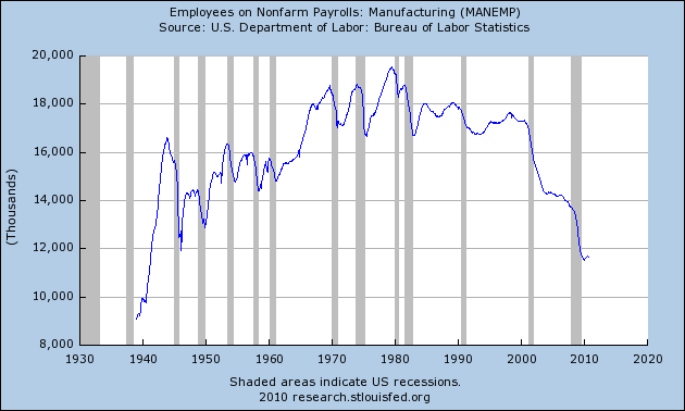 If you were to superimpose a chart of productivity gains from the past thirty years you would see a high inverse correlation. Year over year average increases of about 2% every single year! The jobs are disappearing, but the manufacturing isn’t. Your chart is on manufacturing jobs, not manufacturing. If you looked at the economic census reports on Manufacturers’ Shipments, Inventories and Orders the picture is actually one of nearly continual growth (recent recession aside).