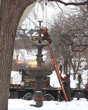 Workers started removing the fountain in Irvine Park, Saint Paul, today. It is being shipped off to Robinson Iron Works in Alabama, where it was made, for a general refurbishment that they hope to have done by May.
