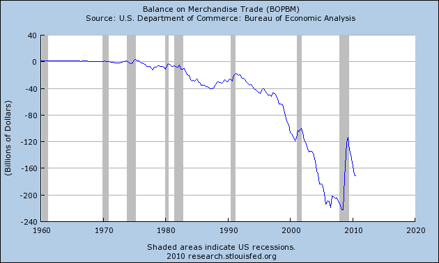 To put this in perspective – the current Balance of Trade deficit runs about 1.0-1.5% of all our production, about what would be necessary to take the current rate of economic growth to the level where it would start creating jobs (about 3.3% per year).