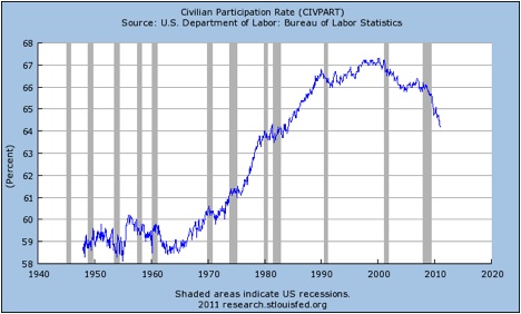 That may sound a bit sour, given the recent drop in the headline unemployment rate. As we all know, however, that number is dropping more because people out of work for too long no longer count. The ongoing problem is better shown by the total employment participation rate, this graph from the St Louis Fed: