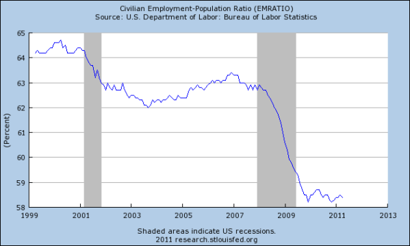 As I tweeted to you earlier, I have wondered for some time if fully employing 2/3 of the population is a sustainable trend. I don’t think it is, and I think that is one picture the graphs make clear: the jobs are not returning.