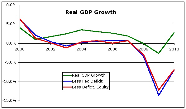 The green line is the official change in real (inflation adjusted) GDP from year to year, which shows how there was a Recession in 2001-2002, some robust growth before the big crash in 2007-2008. Take out Federal deficits over the same period we have the blue line. Taking away the net change in home equity withdrawals, which peaked in 2006 at 2.7% of GDP, and the red line shows that real growth hardly became positive over the last decade.
