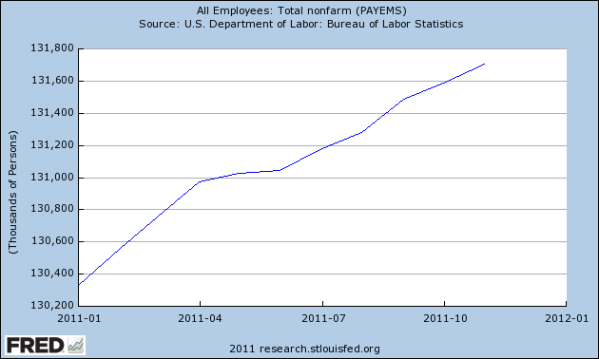 This is what appears to be the story of 2011 in employment. New businesses appear to be springing up and creating jobs, but they won’t really show solid growth until they take off and become established. That’s likely to be the story for 2012.