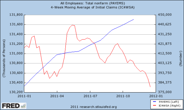 Taking all of this together, there are many signs that the economy is indeed restructuring to form a new economy – one that many of us are not going to recognize in the next few months. It’s not an economy many people are happy with, but it is turning around overall. While 2011 was not the absolute bottom for jobs (that occurred in February 2010), this was the year in which the restructuring which is laying the foundation for a real recovery took place.