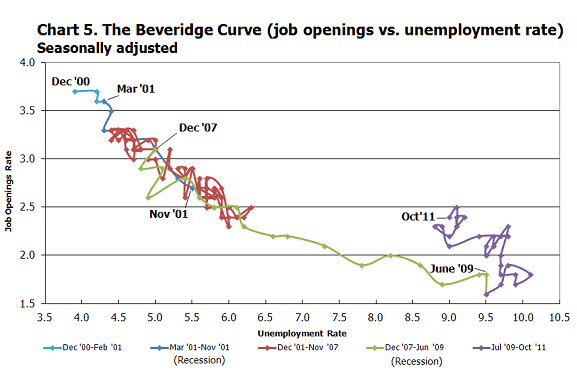 One reason that has been suggested by many people is “Structural Unemployment”, or a lack of potential employees with the right skills for today’s jobs. This argument is quietly based on the principle of restructuring, which is to say that the economy is changing rapidly and people have to learn how to cope with the new one. Structural Unemployment, however, is not likely a major problem. The graph below, called a “Beveridge Curve” after it’s inventor Henry Beveridge, relates job openings to unemployment: