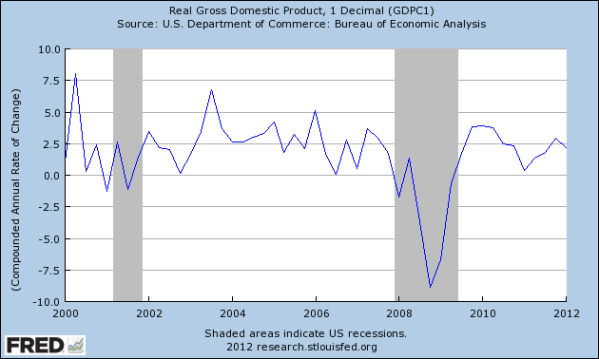 Is the economy growing?  The short answer is “Yes”, but the long answer is “No”.  Real Gross Domestic Product (GDP) growth rate for the first quarter of 2012 came in at 2.2% annualized, which is at least a positive number.  The UK and Spain can’t claim that, falling into recessions for the second time since 2008.  But this is nowhere near enough growth to create jobs and keep the forward momentum building at the end of 2011.