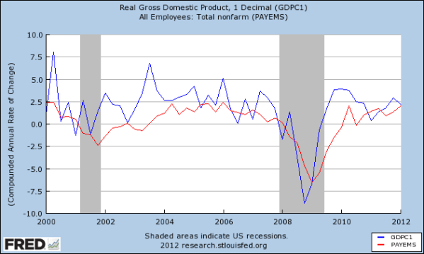 But is it possible to have any kind of sustained job growth without GDP growth quite a bit stronger than we have had so far?  Nearly anyone who follows this stuff will tell you that, no, there is no way that the decent monthly increases in the number of jobs can continue without a stronger economy.