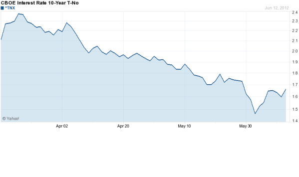 The reason why all this money has been printed is to make money more available. The technical term is “Quantitative Easing”, where a specific quantity of money is sent forth to the world in order to ease the tightness in the credit markets. It’s contrasted with what central banks usually do, which is to lower rates to achieve the same purpose. But take a look at the rate commanded by the benchmark 10 year Treasury bill over the last 3 months: