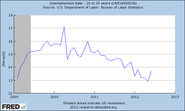 It’s always hard to make absolute sense of “unemployment rates”, given that they don’t count people not looking for work. Kids who stay in grad school don’t count, as do those with a part-time temp gig that pays so lousy they can’t afford to live away from their parents. But what we see is that one in seven young people are completely without work that they want, hardly an improvement from one in six.