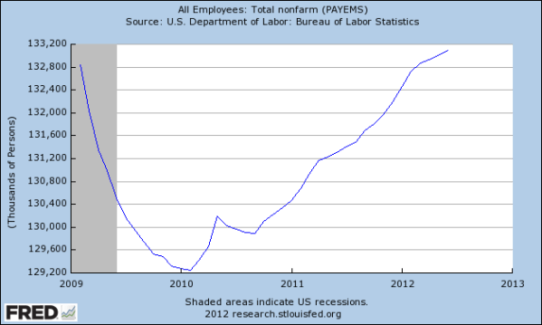 In an election year, there’s someone who benefits from sour thinking, so we can expect more of it. This is the Obama job record so far in one chart from the St Louis Fed, starting in February 2009.
