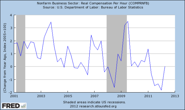There’s little doubt that employment has had trouble keeping up since about 2001.  The lack of jobs is more than just growing unemployment, however.  More people asking for jobs puts downward pressure on wages, which has been accelerating over the last decade.  Consider this chart showing the annual increase in compensation in real (inflation adjusted) terms since 2001: