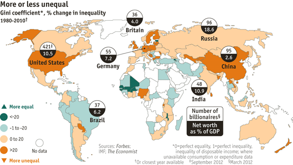 There is no “perfect” answer for the ideal Gini Coefficient, but we can look at changes over time.  In a recent survey by the Economist of changes to the Gini around the world over the last 30 years, we get this map: