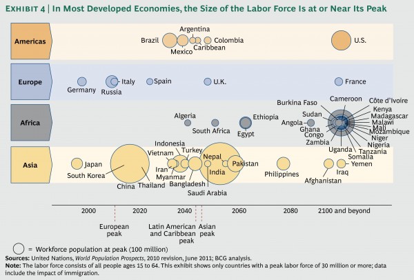 It shows when each nation hits the point where the working age population is scheduled to peak out, by year, and the size of that population is given by the size of the dot. Note that Europe is already hitting its peak, as has Japan. China is there today as well, probably due to their “one child” policies. All of Asia generally maxes out in the 2040s.