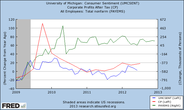 The graph below has 3 different things on it from January 2009.  The blue line is the net change in consumer confidence, as measured by the University of Michigan Survey.  The red line shows  the net change in corporate profits, always a good measure of what we can expect on Walls Street.  And the green line, on the right scale, is the gain of jobs in thousands.