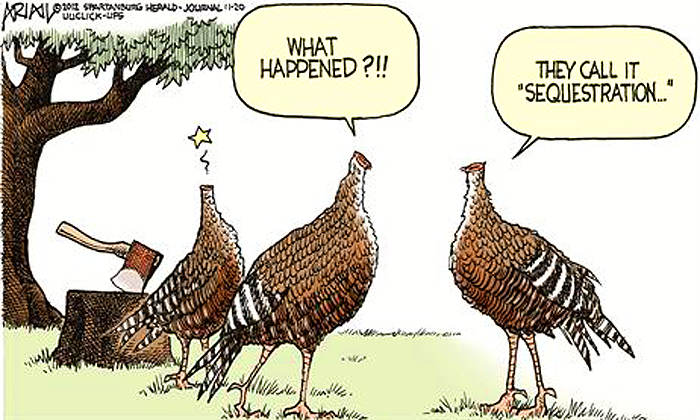 Turkey-SequestrationThere are many plans in place to avoid sequestration.  Each side has its proposals and has formed them into bills for consideration.  There is also the Simpson-Bowles master framework, which is constantly gaining public attention.  What remains a problem, however, is that this is an inside game made unnecessarily complex by personalities and interests.  The need for “spin” shows how each side wants to protect their inside position rather than open it up for public scrutiny – the one thing that could get us past this mess.
