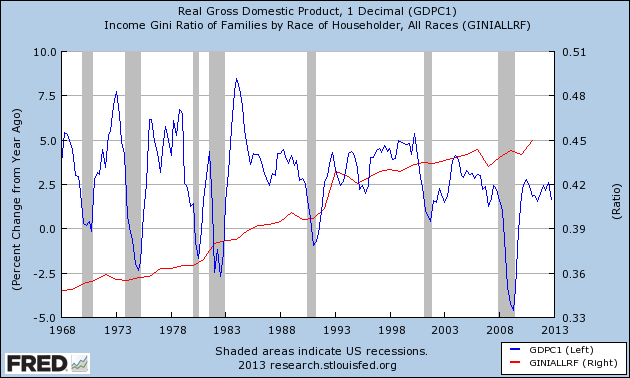 How does that square here in the US?  Below is a murky graph that combines way too much information, but the trends are best shown together.  In blue is the quarterly growth of US GDP since 1968. In red is the Gini Coeficient, a measure of inequality where 0.0 would be perfectly equal income (everyone the same) and 1.0 is perfectly unequal (one person gets it all).