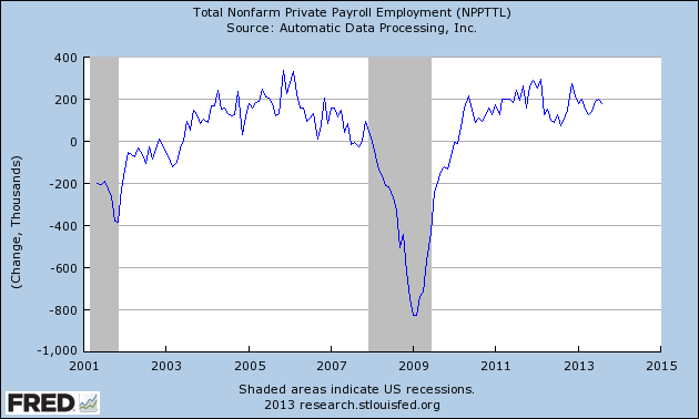 It seems reasonable to divide these data into three categories – below zero (job loss) as a red zone, 0-200k per month a yellow, and above 200k green.  As it stands now, the fall makes all the difference for 2013’s final reputation.  But if you watch only one thing in the ADP report, it should be that 200k jobs gained mark.  We need that.