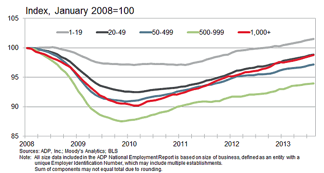 Down towards the bottom of the report we can see this updated monthly in a chart by ADP showing net jobs by size of company, normalized to the peak of 2008.  The different colored lines show the story very well: