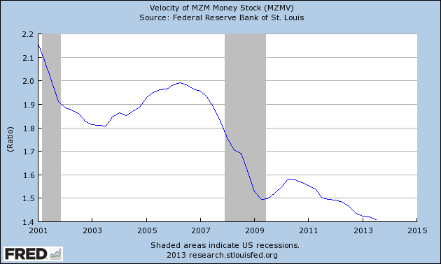 That’s not to say that zero interest is likely to continue forever. As shown before, the key interest rate should probably already have risen to 1% or so, and would have if there was any sign of inflation on the horizon. But with all the money out in the economy that can change very quickly. Consider for a moment the continuing drop in the velocity of money, or the number of times that the money which is out there turns over in any given year. It’s still dropping as Fed policy encourages the growth of the money supply well ahead of the growth in the economy. Updating the graph from the last time we looked at this 17 months ago shows it’s still diving: