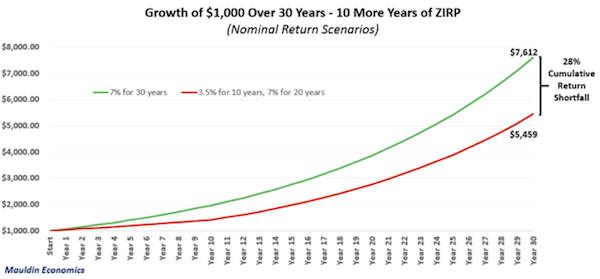 But that doesn’t mean that everything is rosy. An extended period of zero interest rates, already in its fifth year, means that saving is almost a stupid idea. The driving force behind a move away from fixed pensions to a 401(k) model was that the private market would provide a greater return. What will GenXers get for the money they put away for their retirement? The answer is in this chart below, showing the difference between rates stuck at zero for the first 10 years versus a more typical rate of 3.5%, provided by John Mauldin: