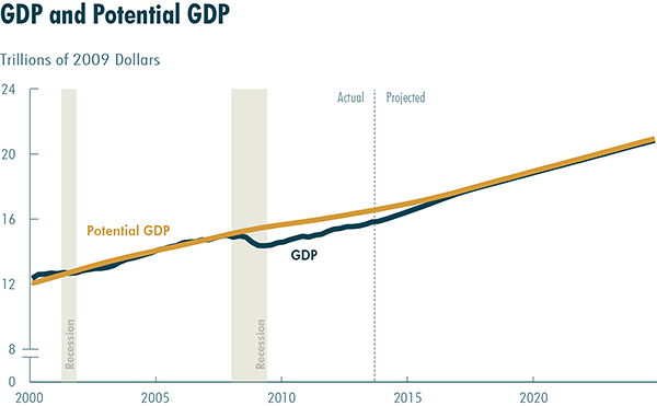 1. Something I don’t get in the first graph. If growth is expected to come at a slow pace what is the “potential GDP” line that is straight up? It seems like the blue line of real GDP is increasing to meet it but we have 3% growth? Something doesn’t add up.