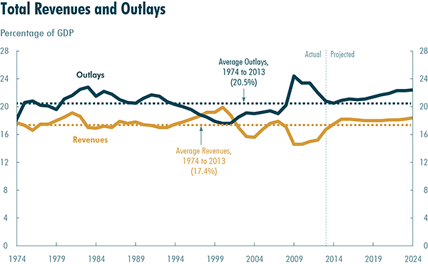 “… revenues are expected to grow at roughly the same pace as GDP whereas spending is expected to grow more rapidly than GDP. In CBO’s baseline, spending is boosted by the aging of the population, the expansion of federal subsidies for health insurance, rising health care costs per beneficiary, and mounting interest costs on federal debt.”