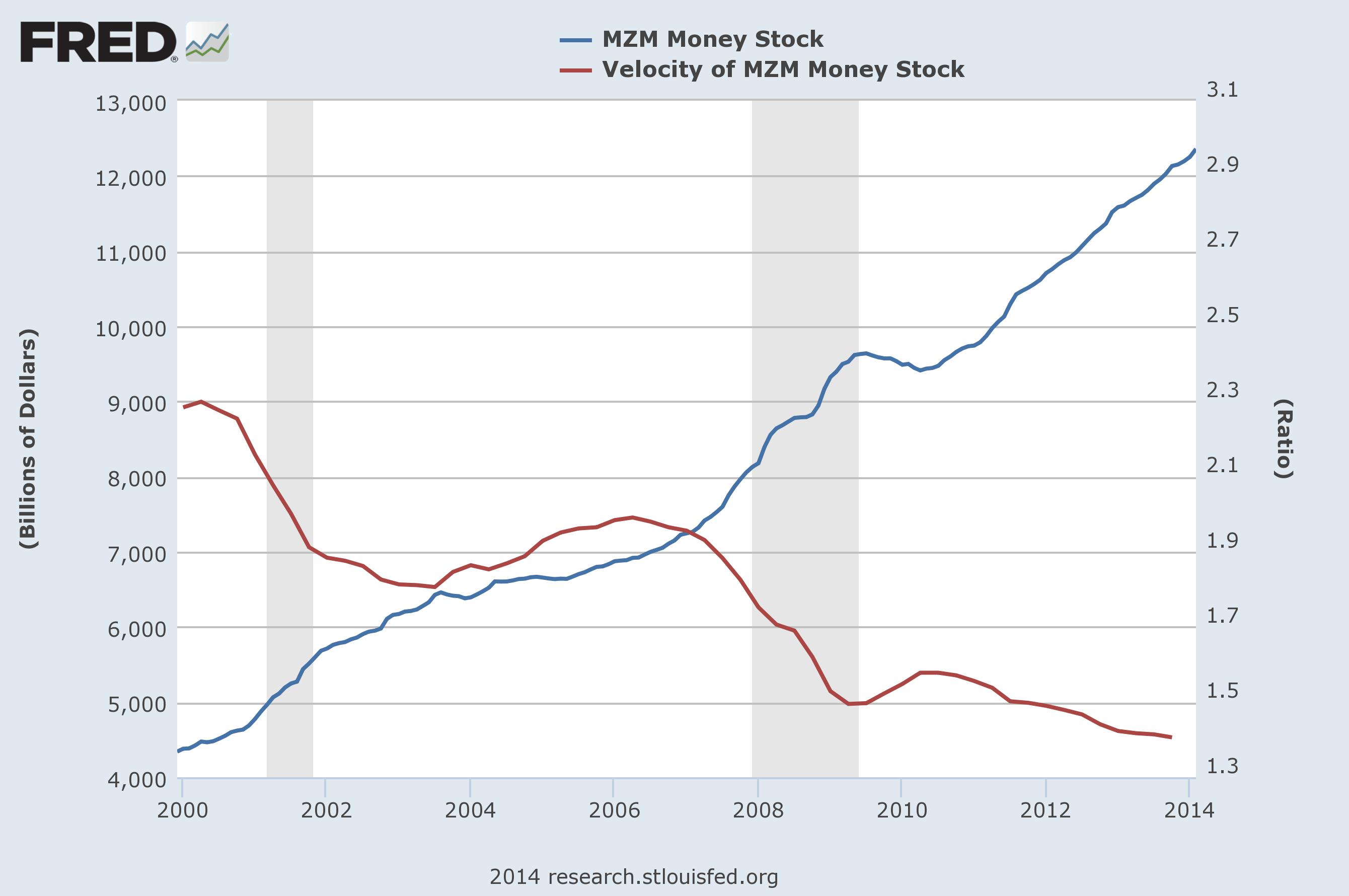moneyBefore we can talk about the “velocity” of money, we have to define what we mean by “money” and how much of it is out there. The broadest measure we have good data on these days is called MZM or “Money at Zero Maturity” – a measure of the bucks printed and in coin, plus all bank accounts and money market accounts. It’s not a complete measure, since it does not include stocks and other investments that people can both borrow against or otherwise use to make themselves feel rich. It’s “demand money”, the stuff that is accessible right now.
