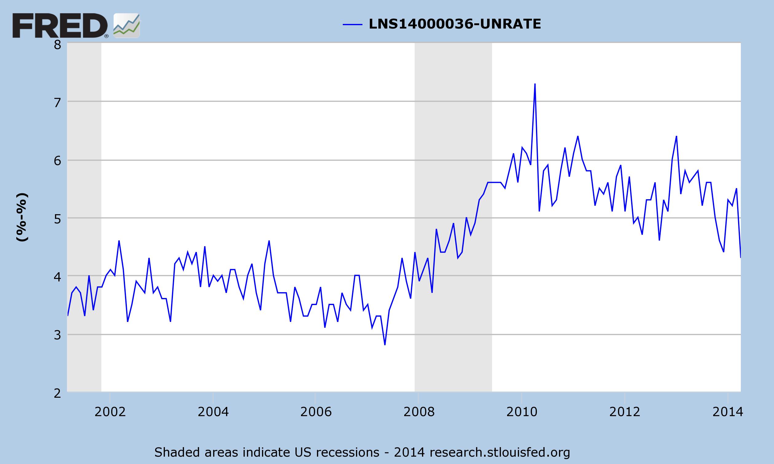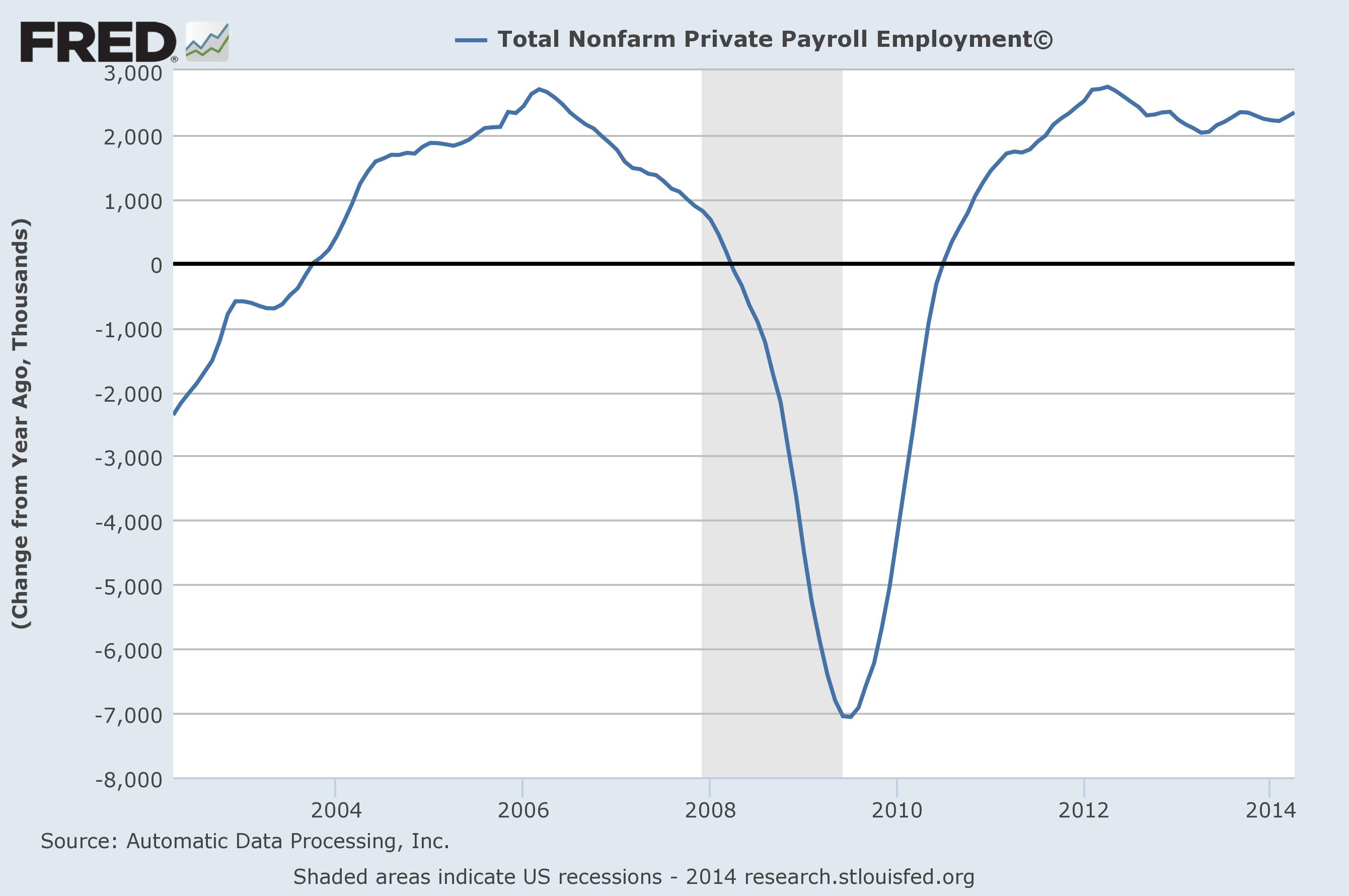Note that in this graph we can see that the last 4 years have produced remarkably stable job growth on the order of 2.3M jobs per year, or just over 190k per month. The peak of 2.7M per year or 225k per month came early on. We can’t say that job growth is accelerating until we see this bop back up to 2.7M per year or higher, which means that April’s gain of 220k jobs has to be sustained over several months. That’s what we’re looking for in 2014. This is a good measure for looking out to the long haul, which seems to be this economy’s speed.