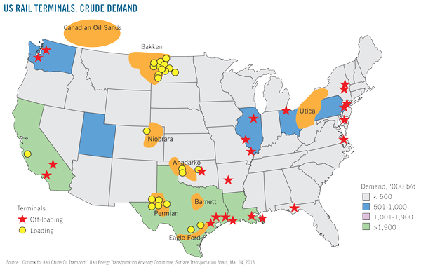 Below is a map of the sources of oil in the US and Canada, along with the key destination refineries. Note that refineries were typically built on the coasts, with a few exceptions, because the oil came in by tanker.