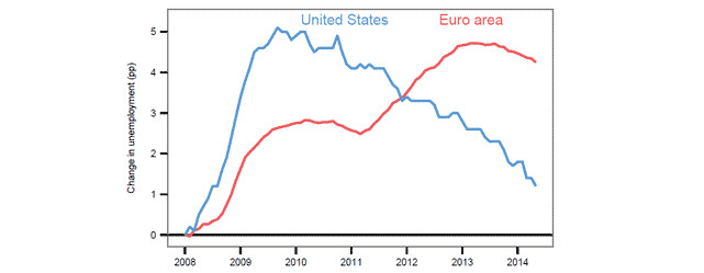 Drahgi of the ECB was even more blunt. The chart, shown here, comes from his presentation. He pretty much told the audience, “If you think you got problems, hoo boy,” and confessed that the Eurozone is lagging way behind the US in job creation, a figure he’s watching carefully. BOJ’s Kuroda said about as much for Japan, too. It’s all anyone is watching all around the world.