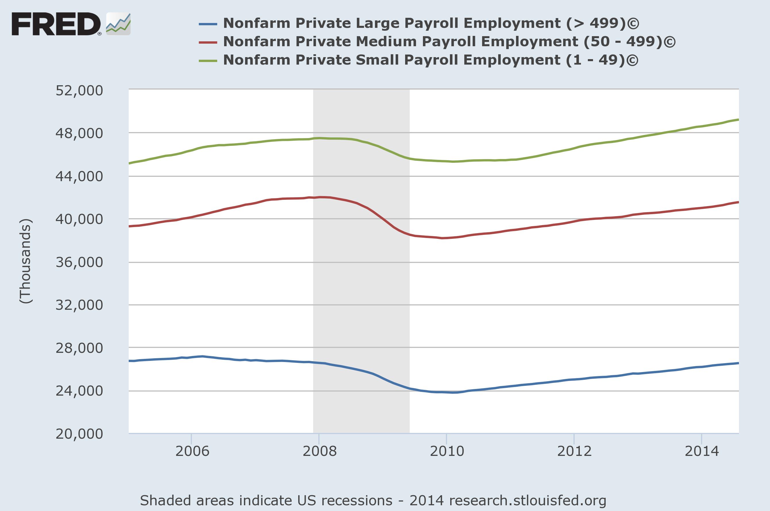 Where total employment came back to the 2008 peak in March 2014, medium sized companies are only hitting their peak now and large companies are still shy of their peak set back in 2006.