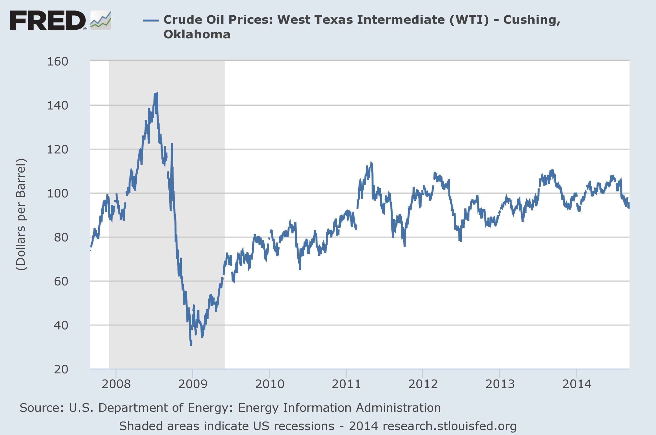 It bounced around for a while after the downturn in 2008 as US wells came online, now settling down in a healthy range of $90-110 per barrel (42 gallons). At $93 per barrel now it’s at the low end of a range and will likely bounce back up into the range we expect, blissfully independent of world events.