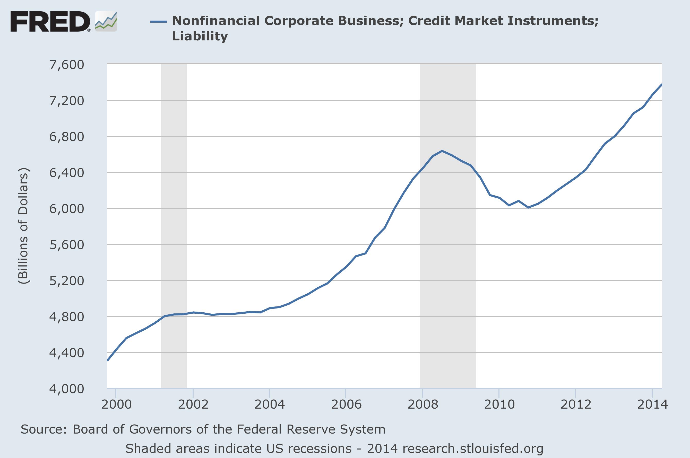 The problem with rising interest rates is there is so much debt out there dependent on cheap money that even a small rise will become a big expense in a big hurry. And you can bet this will be taken care of before the problem can fester into a really big story, at least in part. Take a look at total debt from nonfinancial (goods or service producing) companies since 2000: