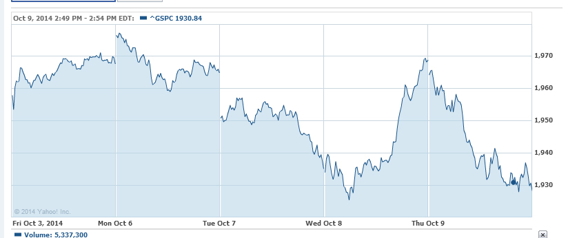 While looking at stocks over a five day period is going to give anyone invested in the market an early death, the last five days have been particularly interesting. There isn’t actually a direction to this market other than volatile. Here is trading on the S&P500 over the last five days: