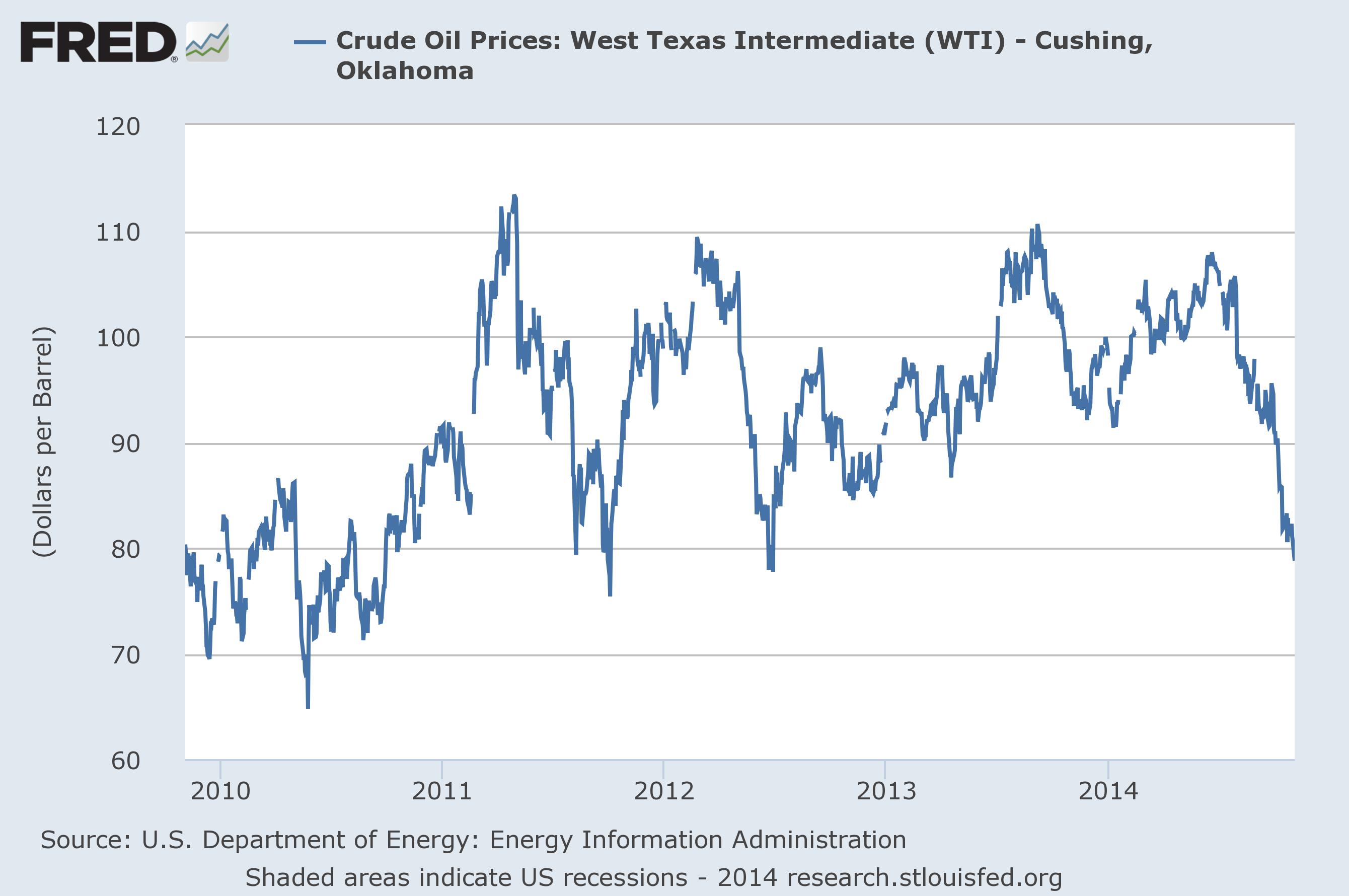 The issue at hand is the price of the benchmark WTI, a middle grade of oil that serves as a standard for prices around the world. Here is the price of WTI since 2010: