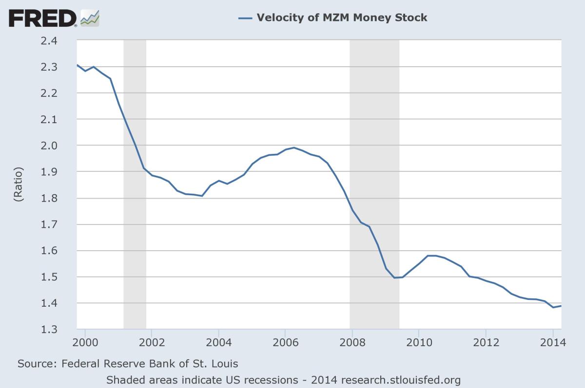 MZMV Published 24 December 2014 at 2680 × 1780 in Happy Christmas, Happy New Year Next → Velocity of money, as MZM, since 2000. Data from the St Louis Federal Reserve