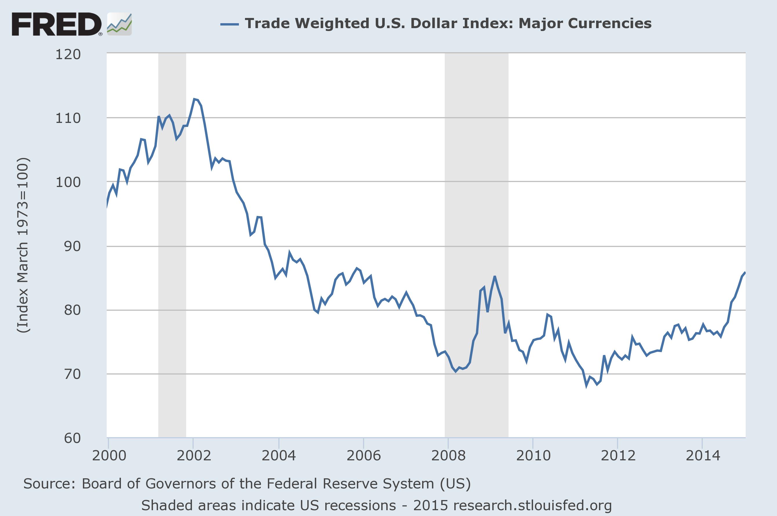 In historic terms, it has a long way to go, too. Below is the US Dollar Index, a measure of the strength of our currency against a basket of other currencies weighted by how much trade we do with them. We’re nowhere near the level of strength we enjoyed back in 2000, before the recent Depression started, despite the recent increase: