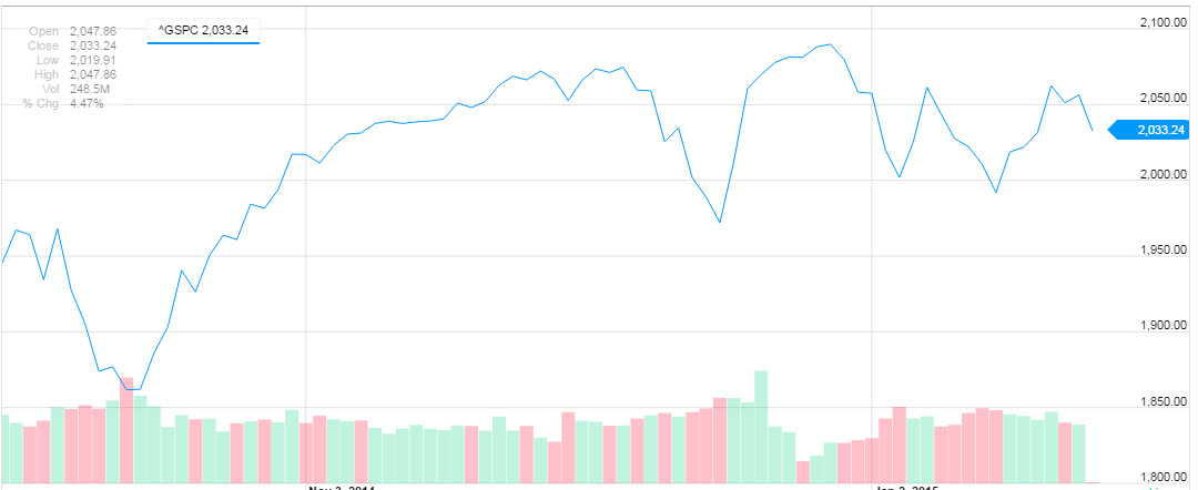 At that time, the prediction was for a lot of volatility and a small swoon by the end of the year. What we got shortly after that posting was an S&P500 dive back down to where it started the year, followed by a ragged increase. Not exactly a good prediction. Here’s what it looked like from October until today: