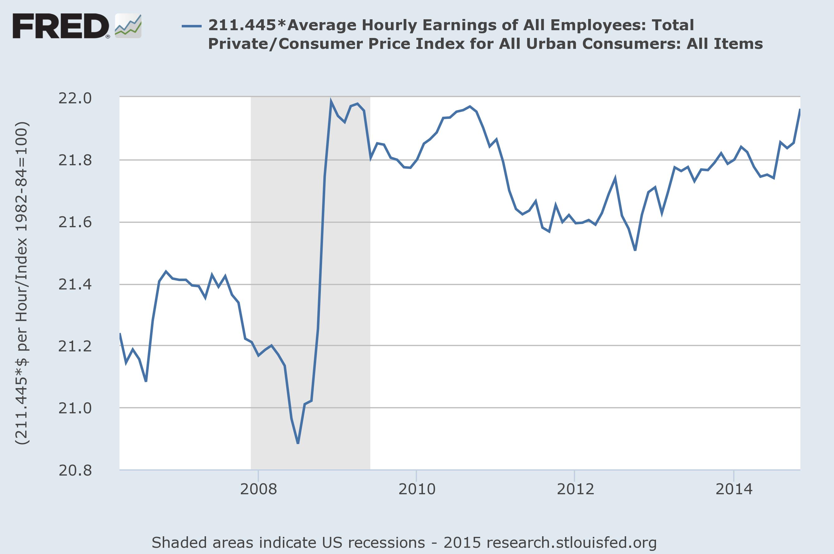 We can see how upward pressure on wages may already be happening in this chart that shows average wages, adjusted to constant 2008 Dollars: