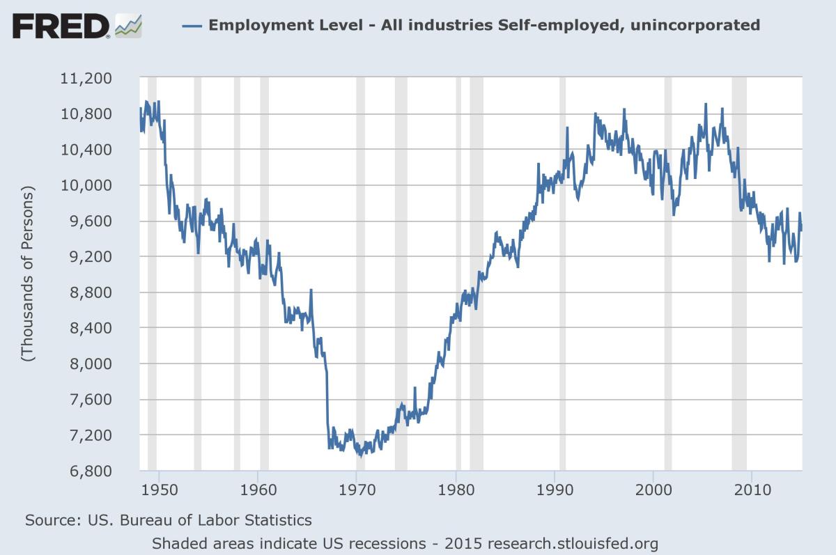 selfemployed Published 19 February 2015 at 2680 × 1780 in Contracted Change Next → The official “Self Employed” number from the BLS over time.