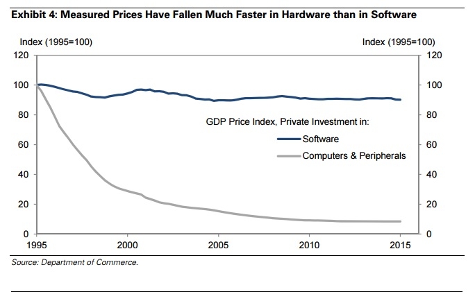 Exhibit 4 from Goldman’s research, showing how computer hardware has a price “deflator” since 1995 but software does not.