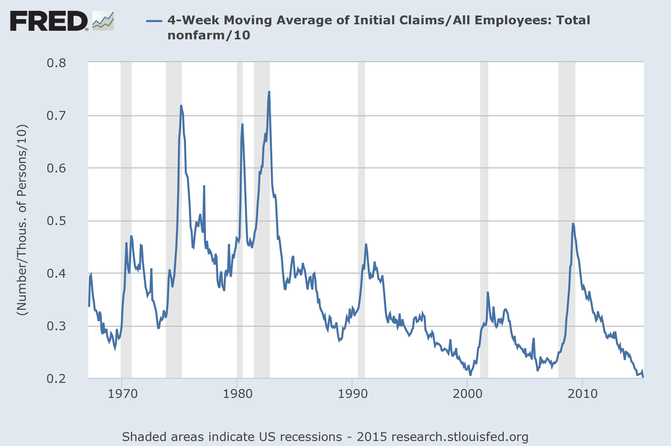 Not any more. In fact, if you adjust the initial claims by dividing it by the total number of jobs you get the graph below, which shows initial claims as a kind of “turnover” figure in jobs as a percent lost each week: