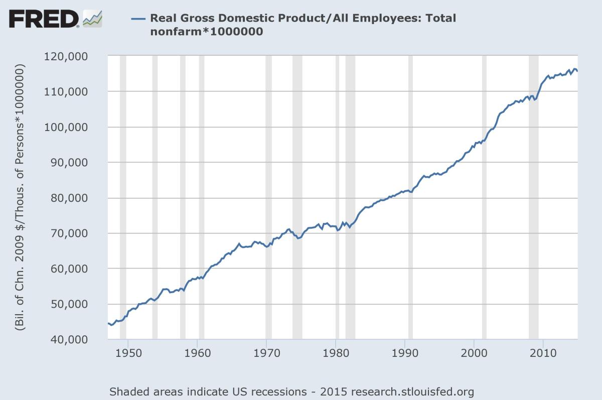 GDPperWorker Published 13 July 2015 at 2680 × 1780 in Broken Social Contract ← Previous Next → Productivity, defined as real (inflation adjusted) GDP per worker. Data from the St Louis Federal Reserve.