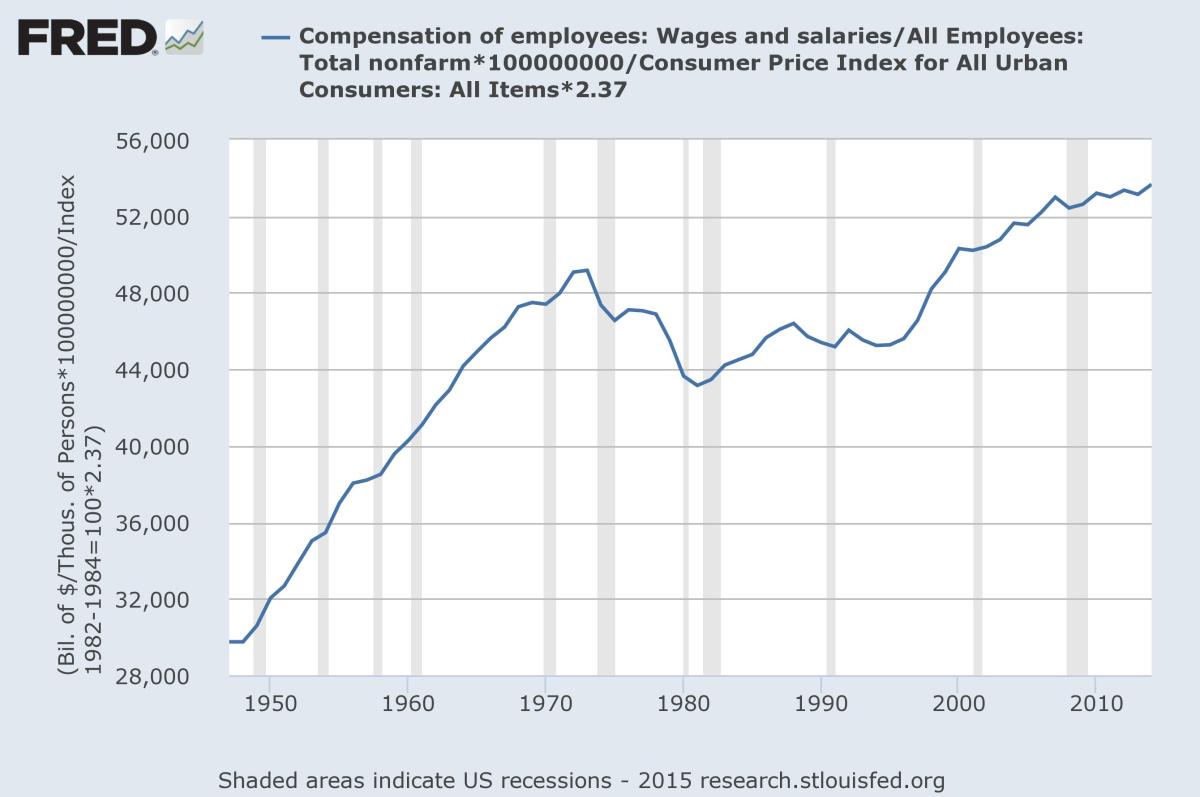 WagesInflation Published 13 July 2015 at 2680 × 1780 in Broken Social Contract ← Previous Next → Average (median) pay per worker in constant 2015 Dollars. Data from the St Louis Federal Reserve.