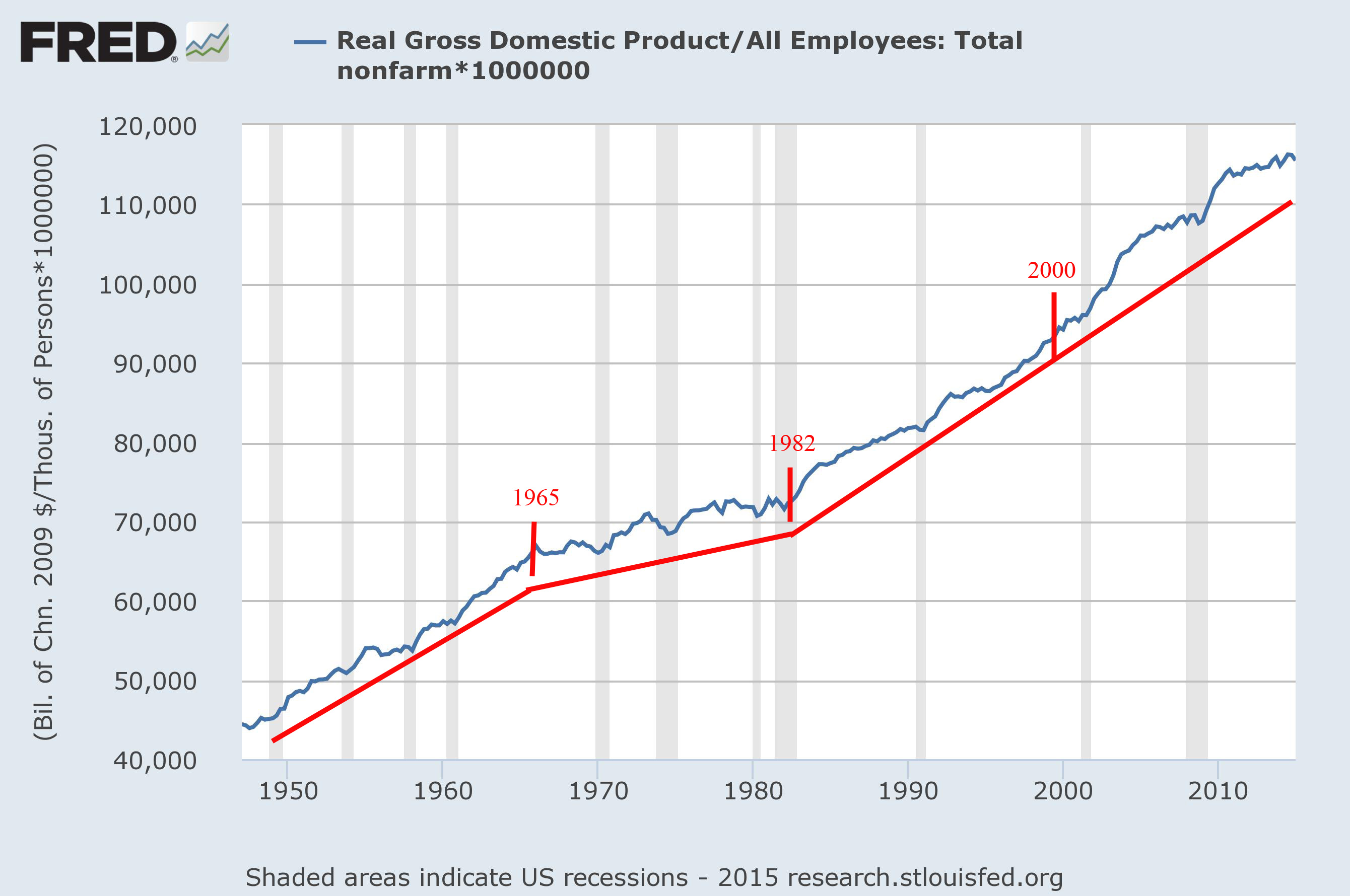 But what of output per worker? Is it possible that workers are slacking off and don’t deserve the same arrangement they had in the immediate Post WWII era? An analysis of productivity, or output per worker, shows some interesting trends that may point to more unspoken agreements that the various markets for capital and labor expect. These trends follow business cycles, and as such point to some important changes that are necessary as we move ahead into the next cycle in the next few years.