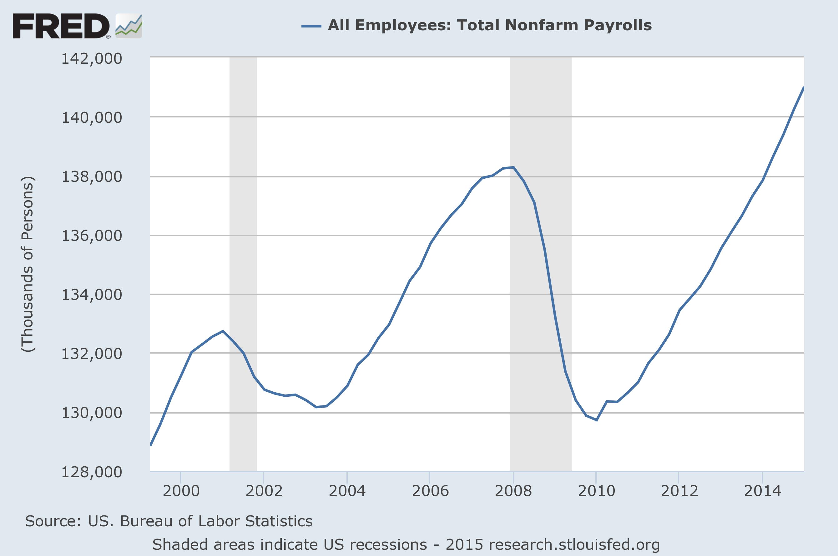 Note that when the official “recessions” of 2001 and 2008 came there was actually a net rise in productivity. By this chart, they look like good years for business even though we know they were terrible for the job loss and stock buying both. We can see what happened by paying attention to those times when productivity gains rose most substantially by comparing them to the chart of total employment in thousands in the same period:
