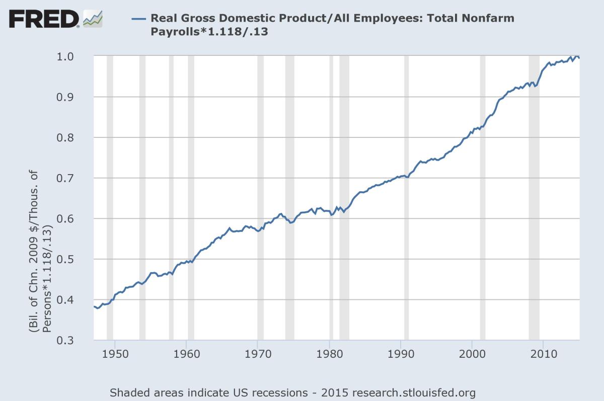 ProductivityIndex Published 30 July 2015 at 2680 × 1780 in Fight for $15 ← Previous Next → A “productivity index” where 2015 output per worker is normalized to 1.00. Data from the St Louis Federal Reserve.