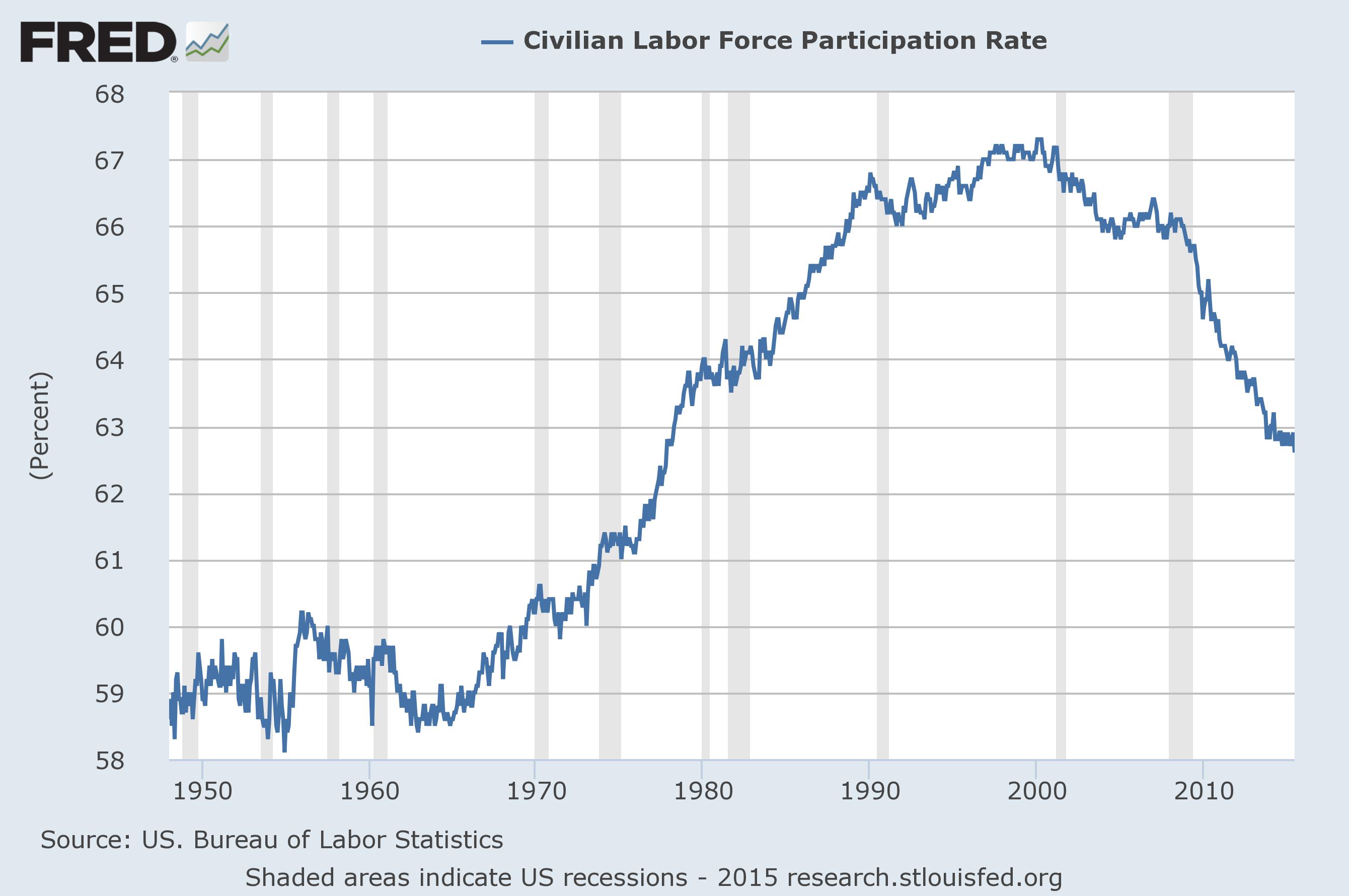 It all peaks at 67% in 2000, but has dropped back to 63% today. The glory days, before 1973, had it never higher than 60% overall. The different? About 6.7M people in the workforce. You can be sure that as Baby Boomers retire we will head down to 60% again – or even lower.