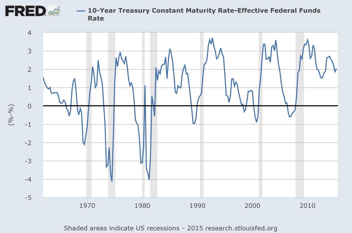 10yrSpread Published 26 August 2015 at 2680 × 1780 in About That Rate Increase … Next → The “spread” between the 10yr Treasury Bill and the Fed Funds Rate. Data from the St Louis Federal Reserve.