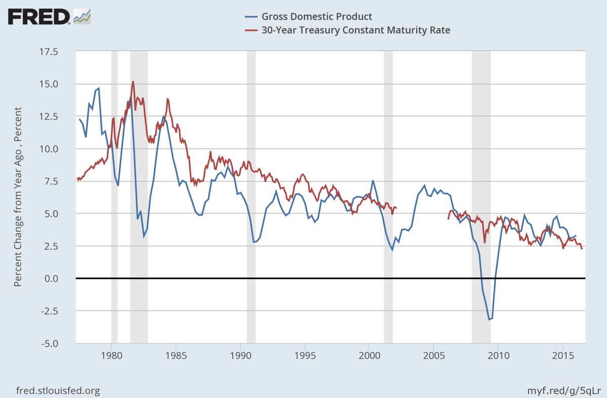 fredgraph (1) Published 15 July 2016 at 3044 × 1996 in Forcing Investment ← Previous Next → Change in GDP versus the yield of the 30yr TBill since 1973. Data from the St Louis Federal Reserve.